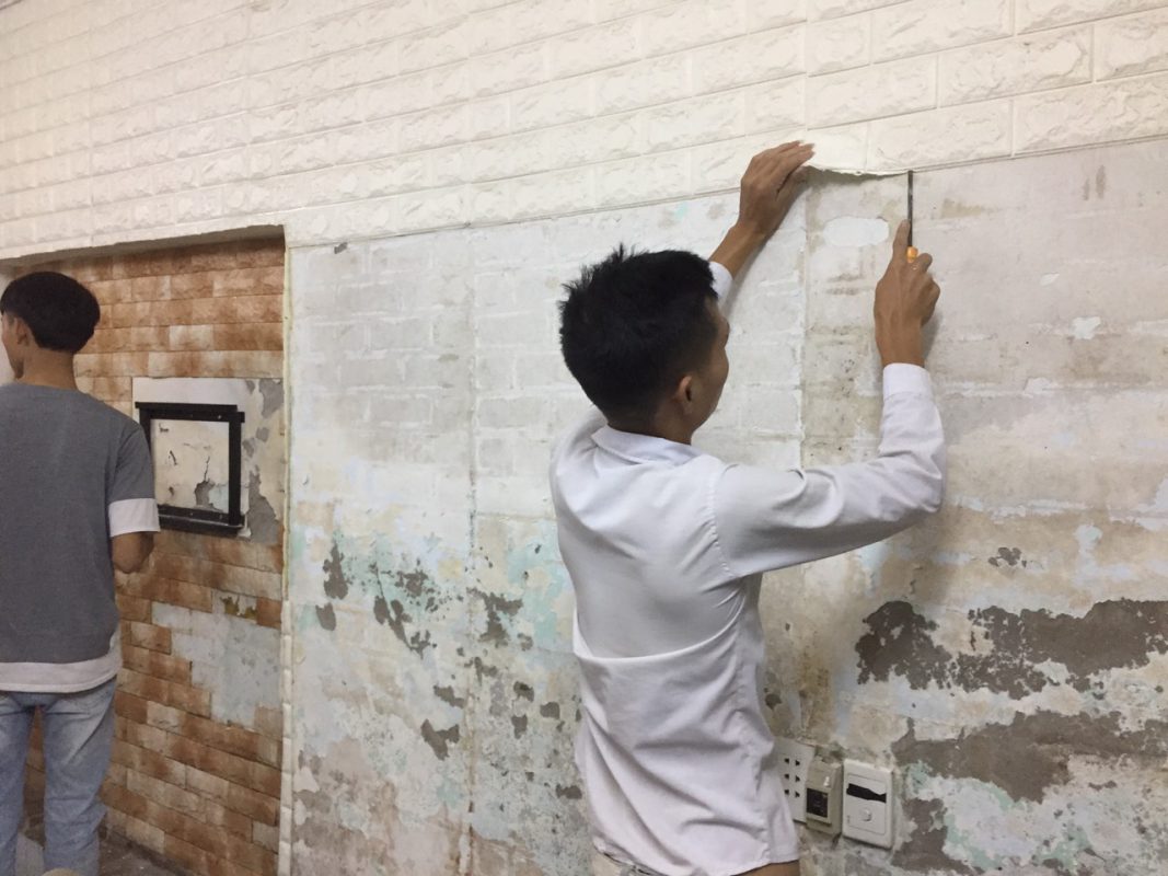 Bước 1: Gạt toàn bộ lớp vữa khu bức tường bị ẩm, bong tróc, rộp, hay gấy dán tường ra.