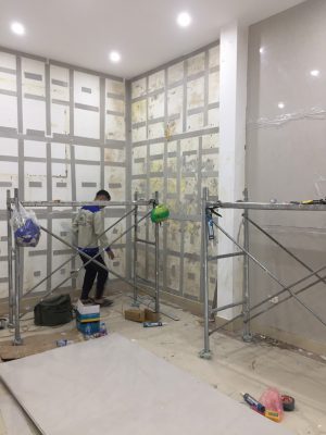 Bước 2: Chẩn bị cắt cốt bằng chính vật tấm pvc ra, rôi tiến hành đóng cốt lên tường, liên kết cốt với tường bằng đinh bê tông 2,5cm đến 4cm, khổ độ o 40cm x 40cm.