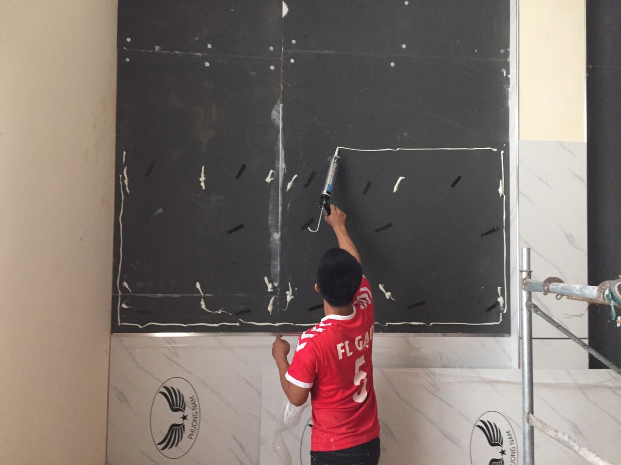 Bước 4: Bôi keo và dán băng dính xôp xong tiến hành ôp tấm, rồi vỗ đều lên mặt tấm cho tấm bám chặt keo.